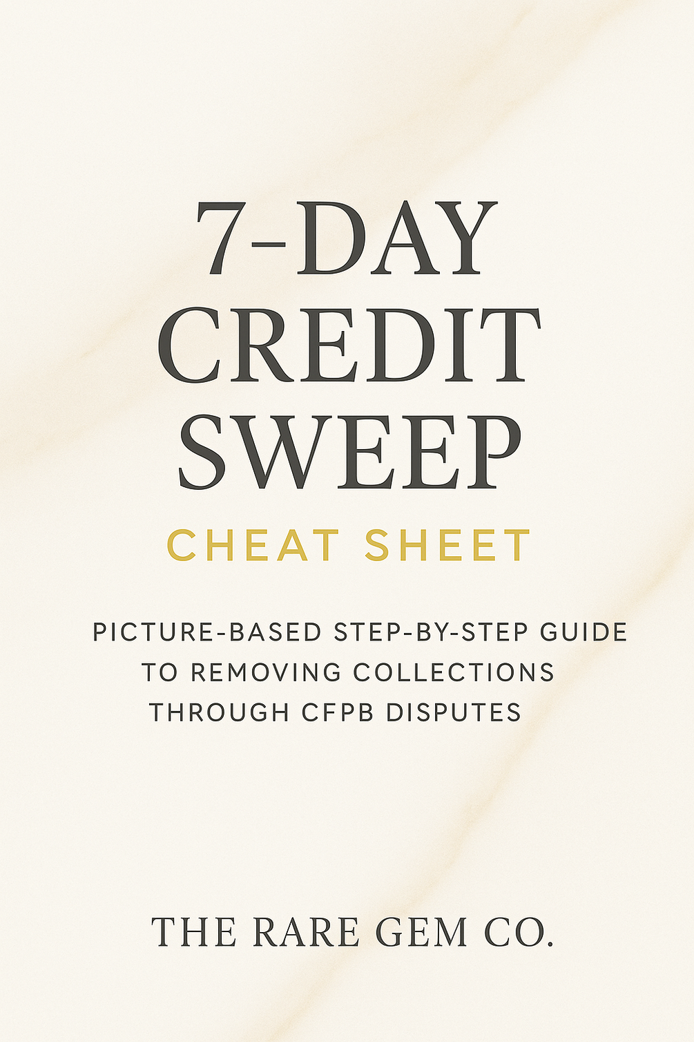 A beginner-friendly, step-by-step cheat sheet designed to help you remove collections from your credit report using CFPB disputes and Metro 2/FCRA-based language. Includes templates, screenshots, and proven strategies trusted by The Rare Gem Co.